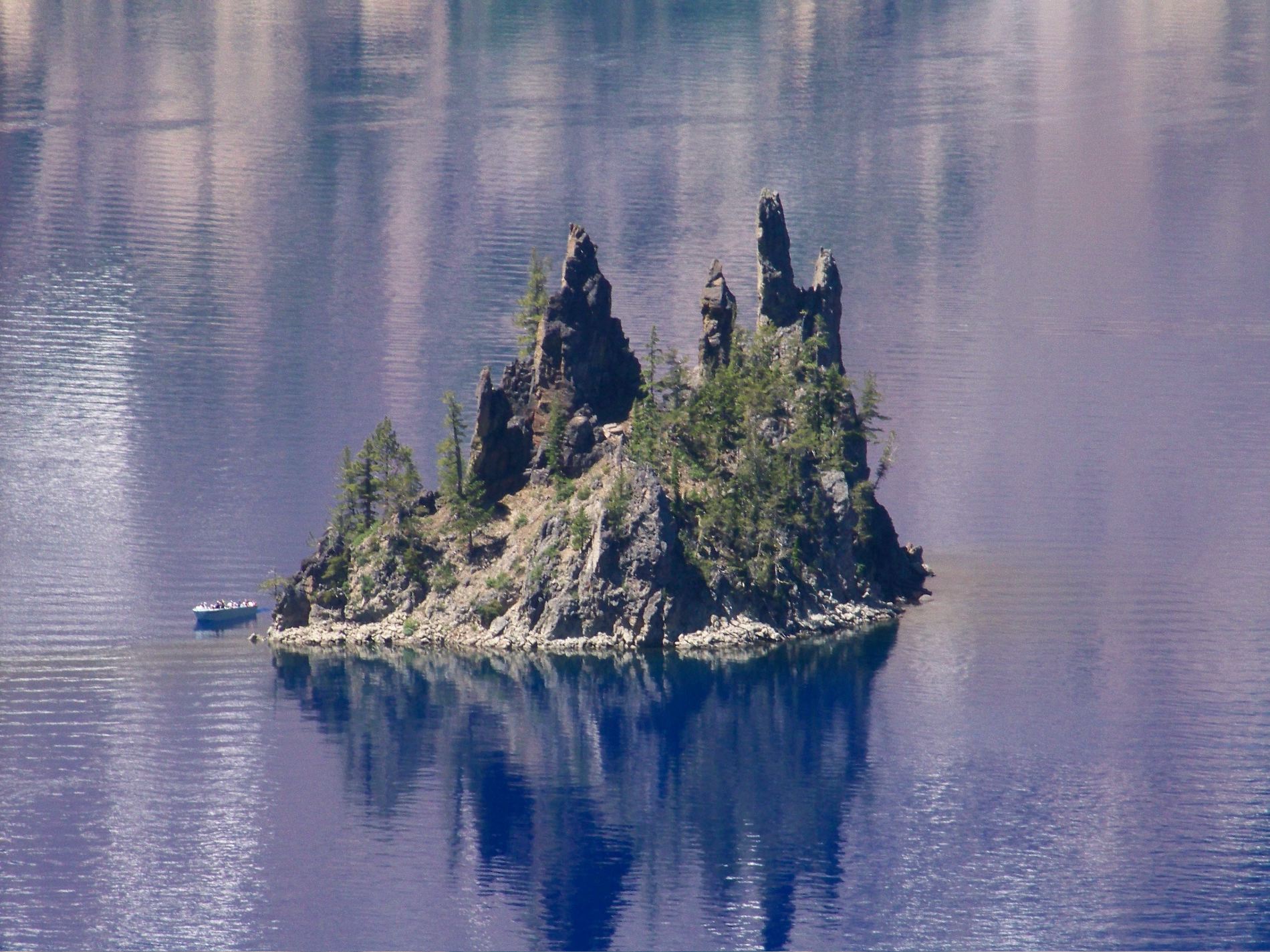 Close up f the island. The water looks purple because of reflections.