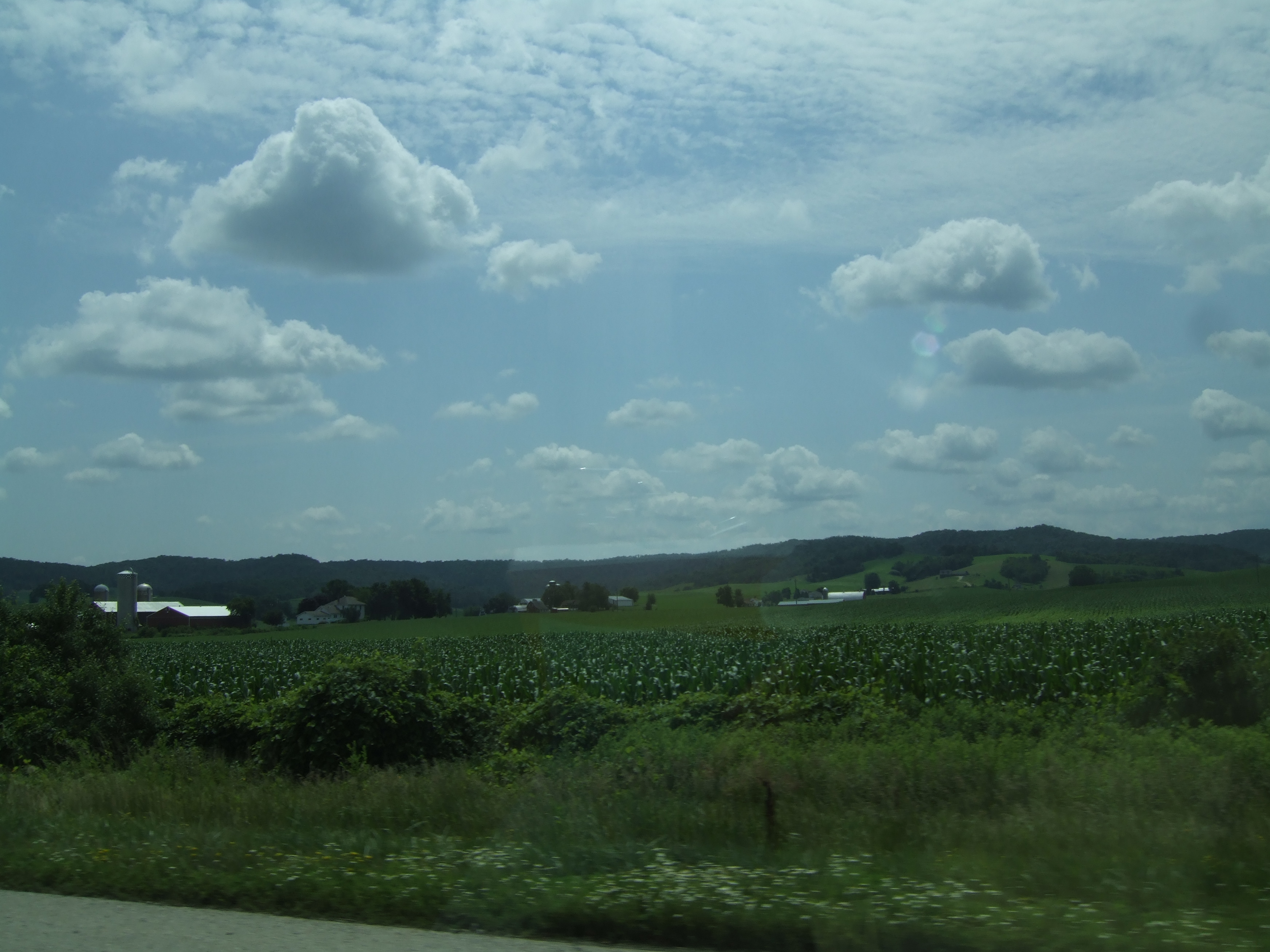 Typical Wisconsin: green, corn and farm buildings. Brings back memories.