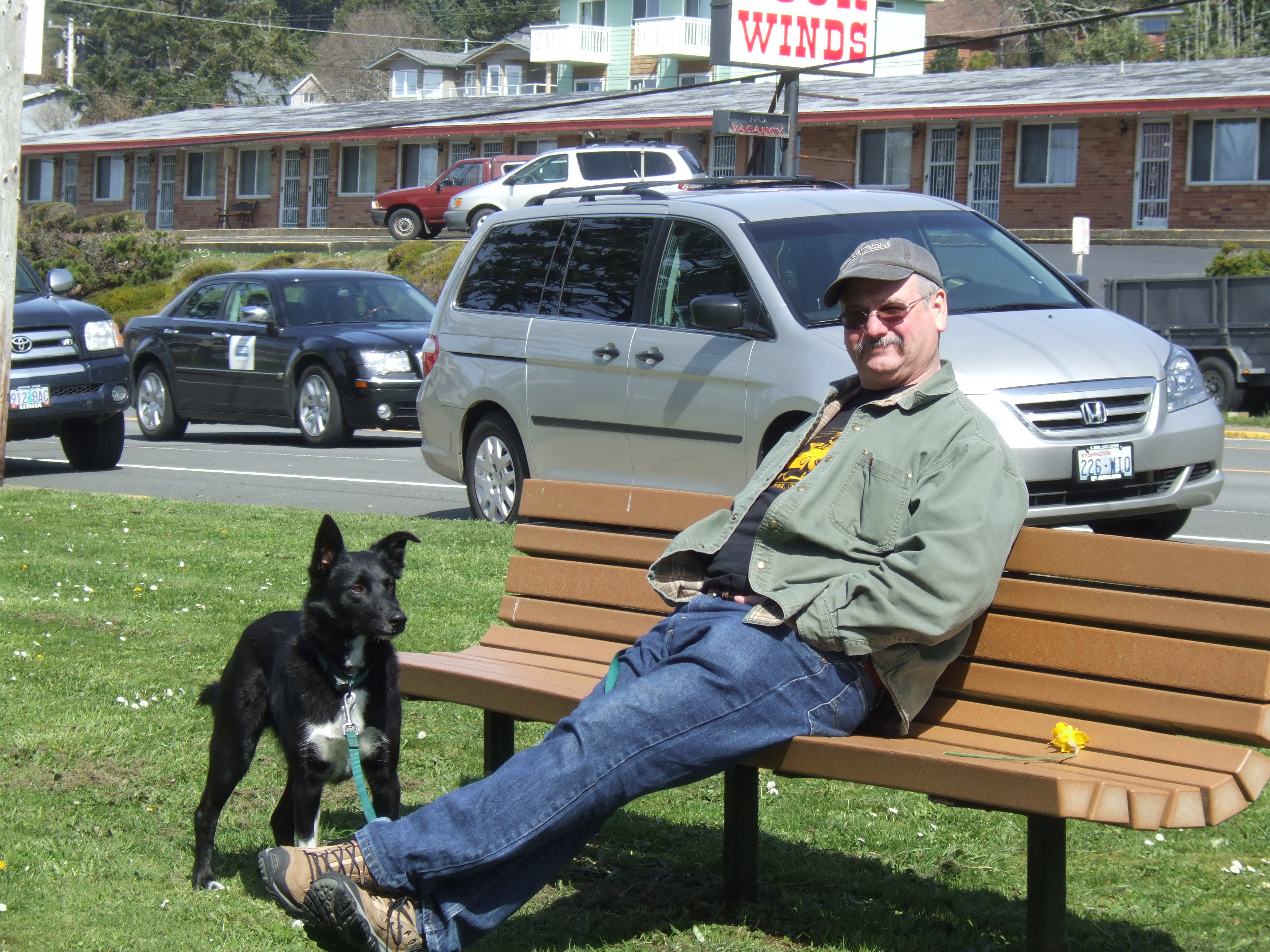 Curtis is resting after a good lunch. Most places have great food but with high prices.